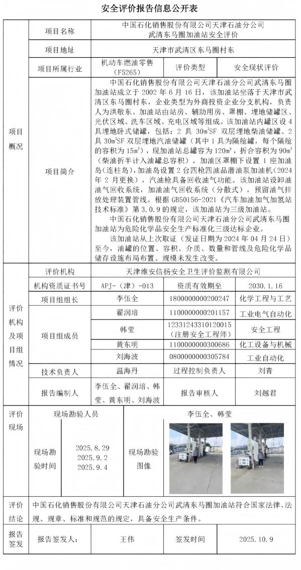 中国石化销售股份有限公司天津石油分公司武清东马圈加油站安全评价