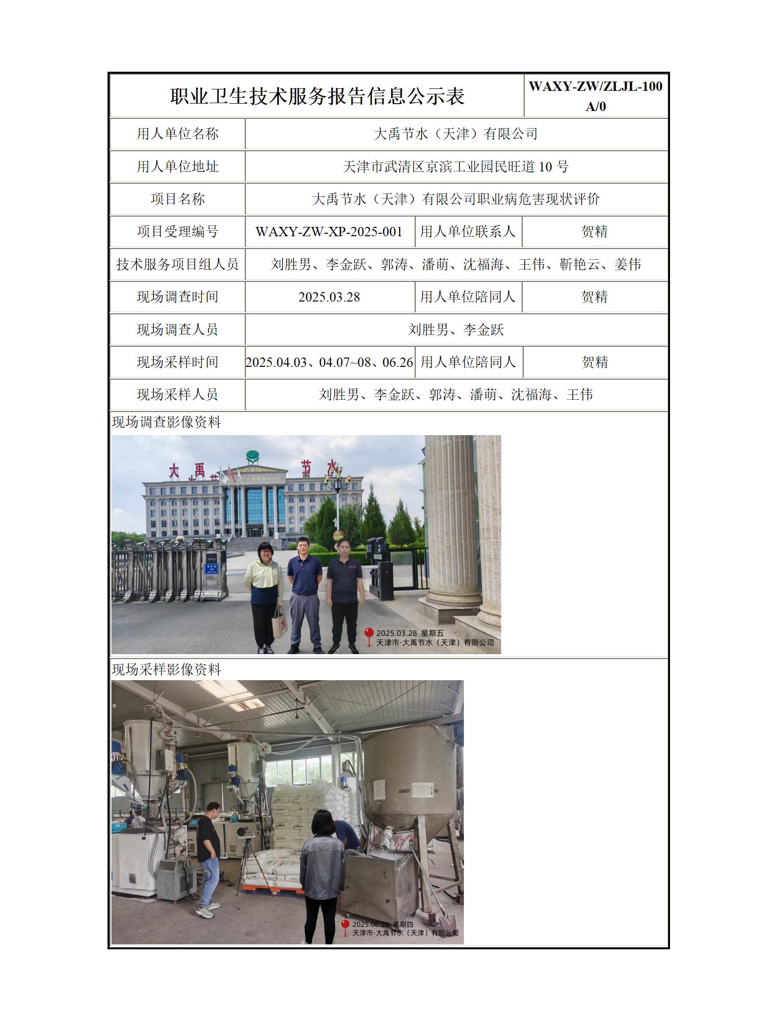 大禹节水(天津)有限公司职业病危害现状评价报告信息公示表