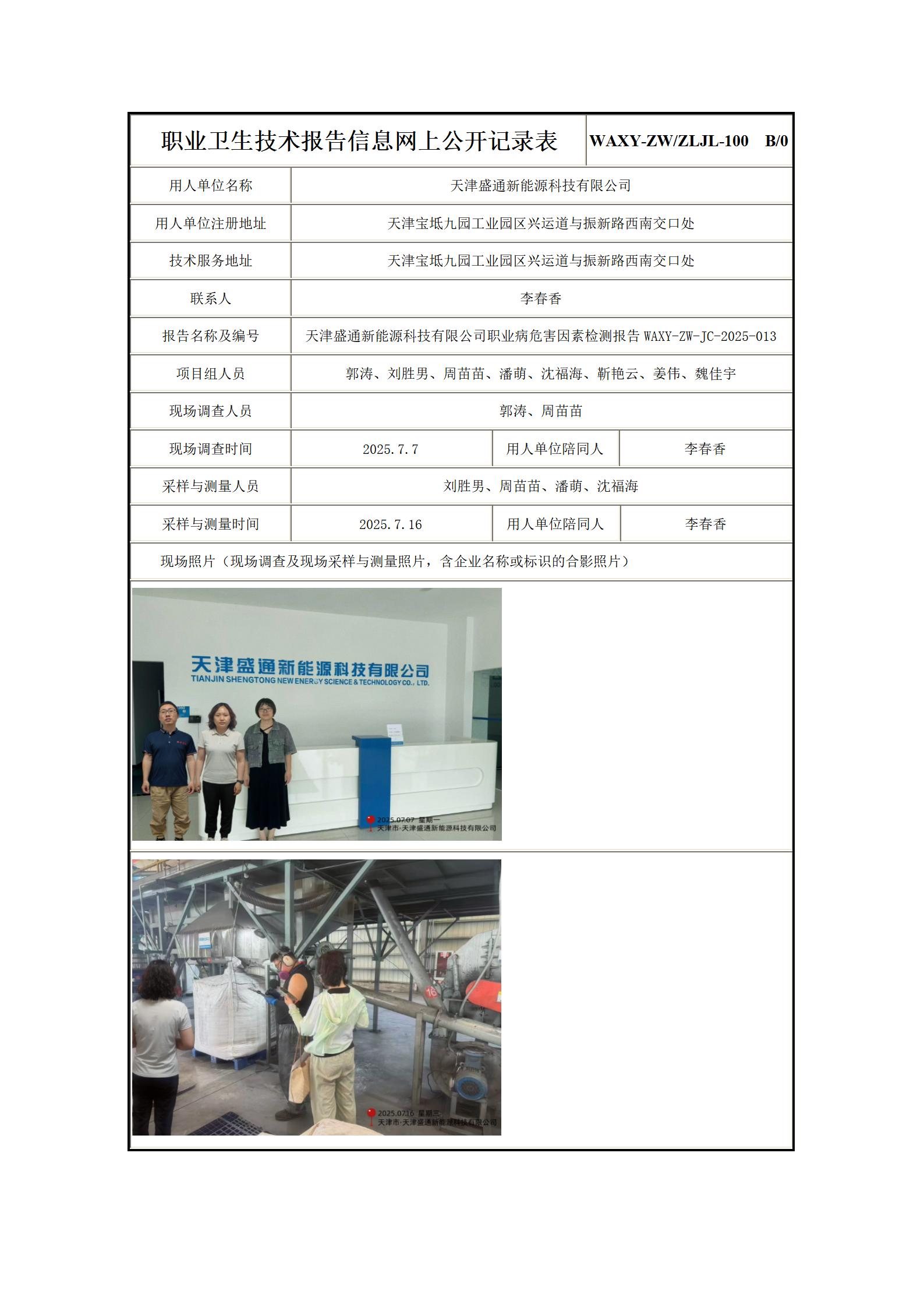 天津盛通新能源科技有限公司职业病危害因素检测报告信息公示表