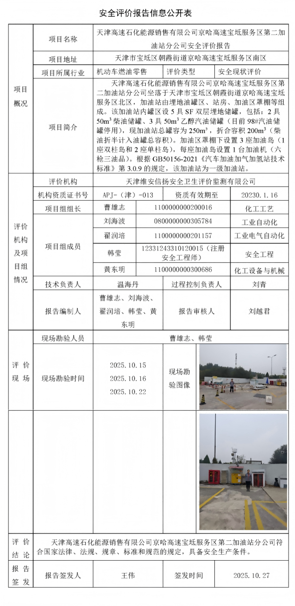 天津高速石化能源销售有限公司京哈高速宝坻服务区第二加油站分公司安全评价报告