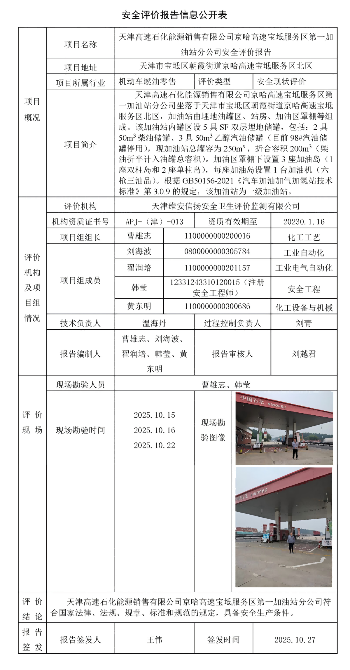 天津高速石化能源销售有限公司京哈高速宝坻服务区第一加油站分公司安全评价报告