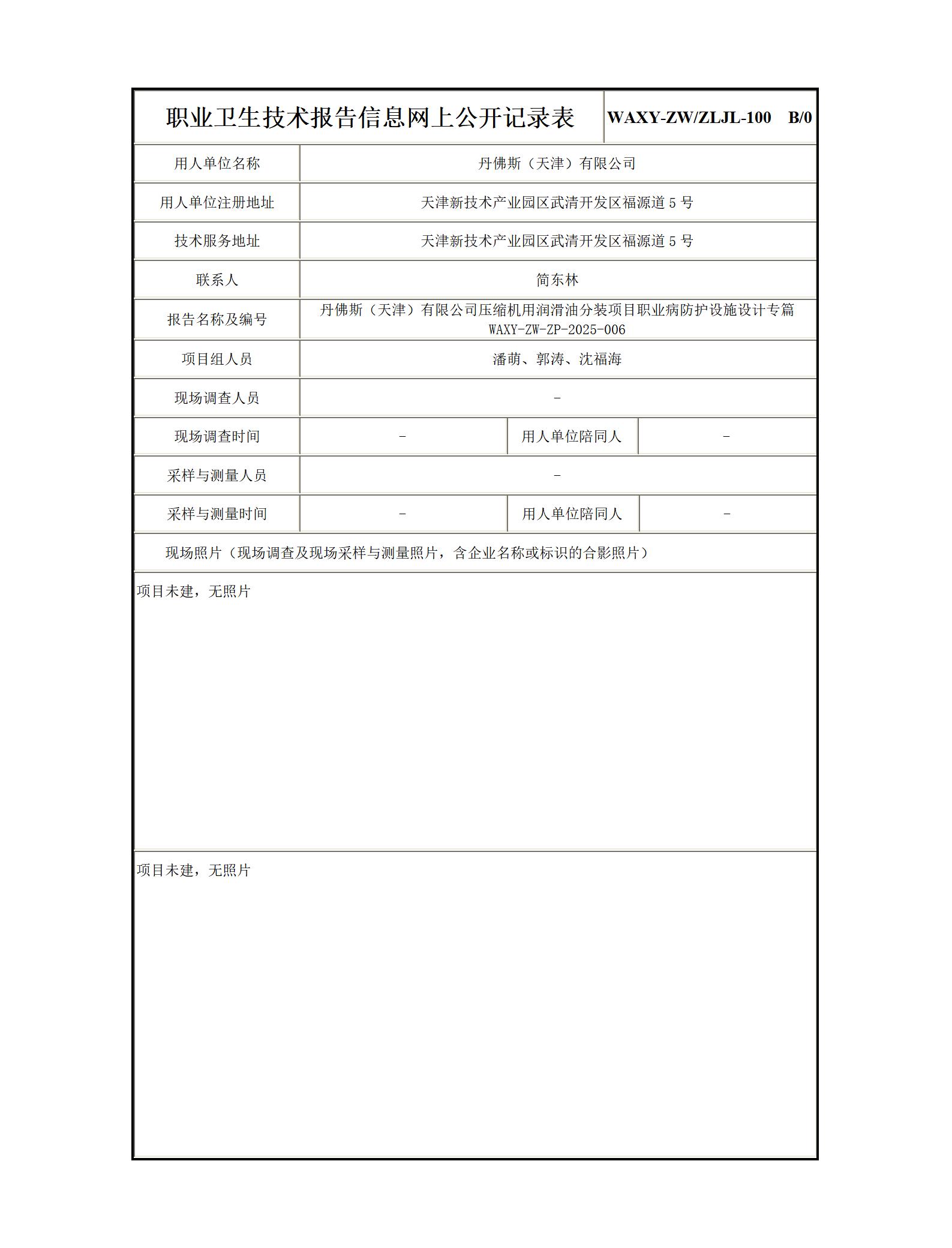 丹佛斯(天津)有限公司压缩机用润滑油分装项目职业病防护设施设计专篇报告信息公示表