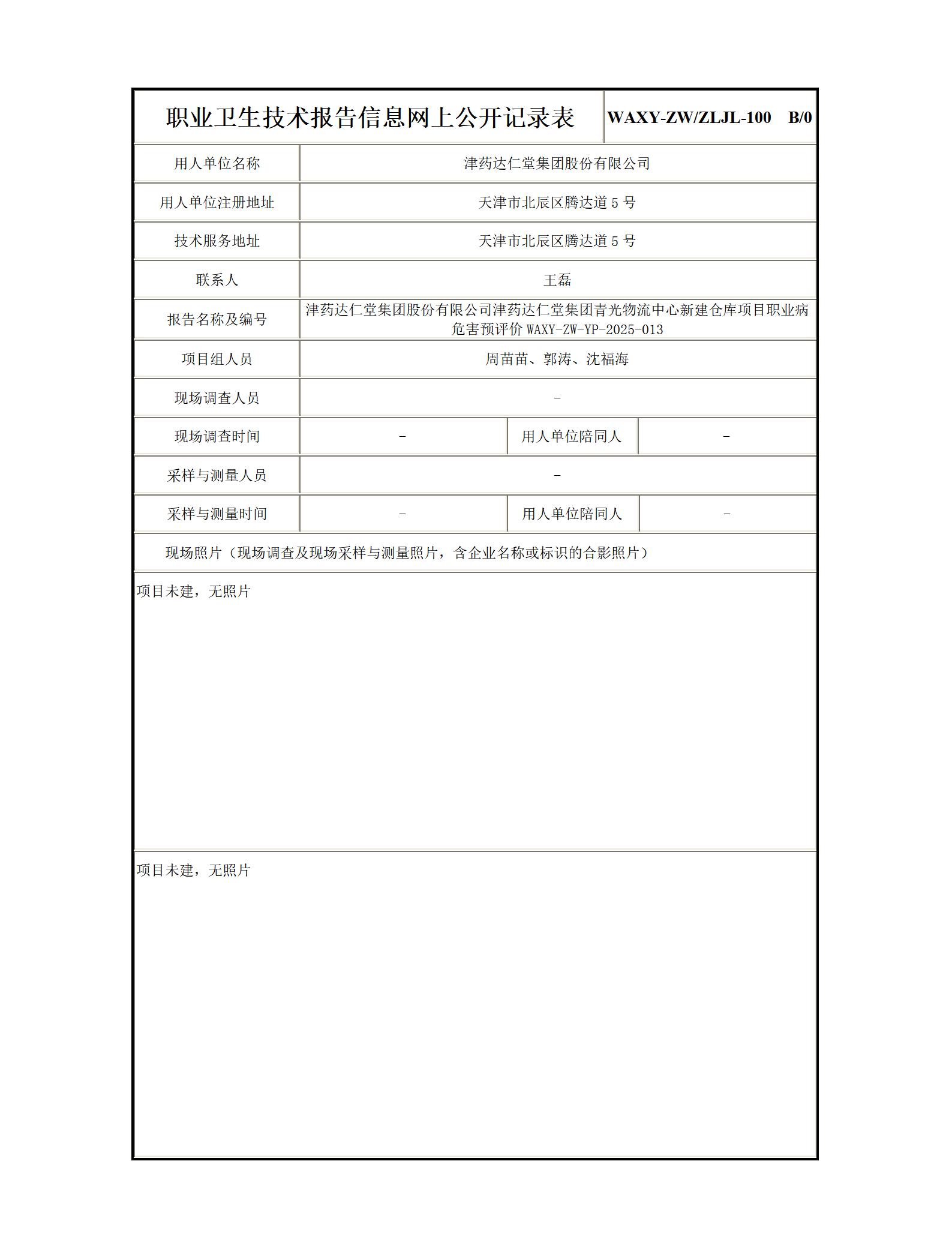 津药达仁堂集团股份有限公司津药达仁堂集团青光物流中心新建仓库项目职业病危害预评价报告信息公示表