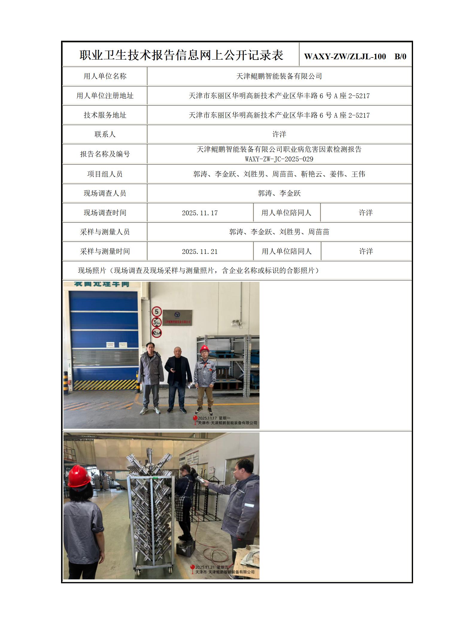 天津鲲鹏智能装备有限公司职业病危害因素检测报告信息公示表