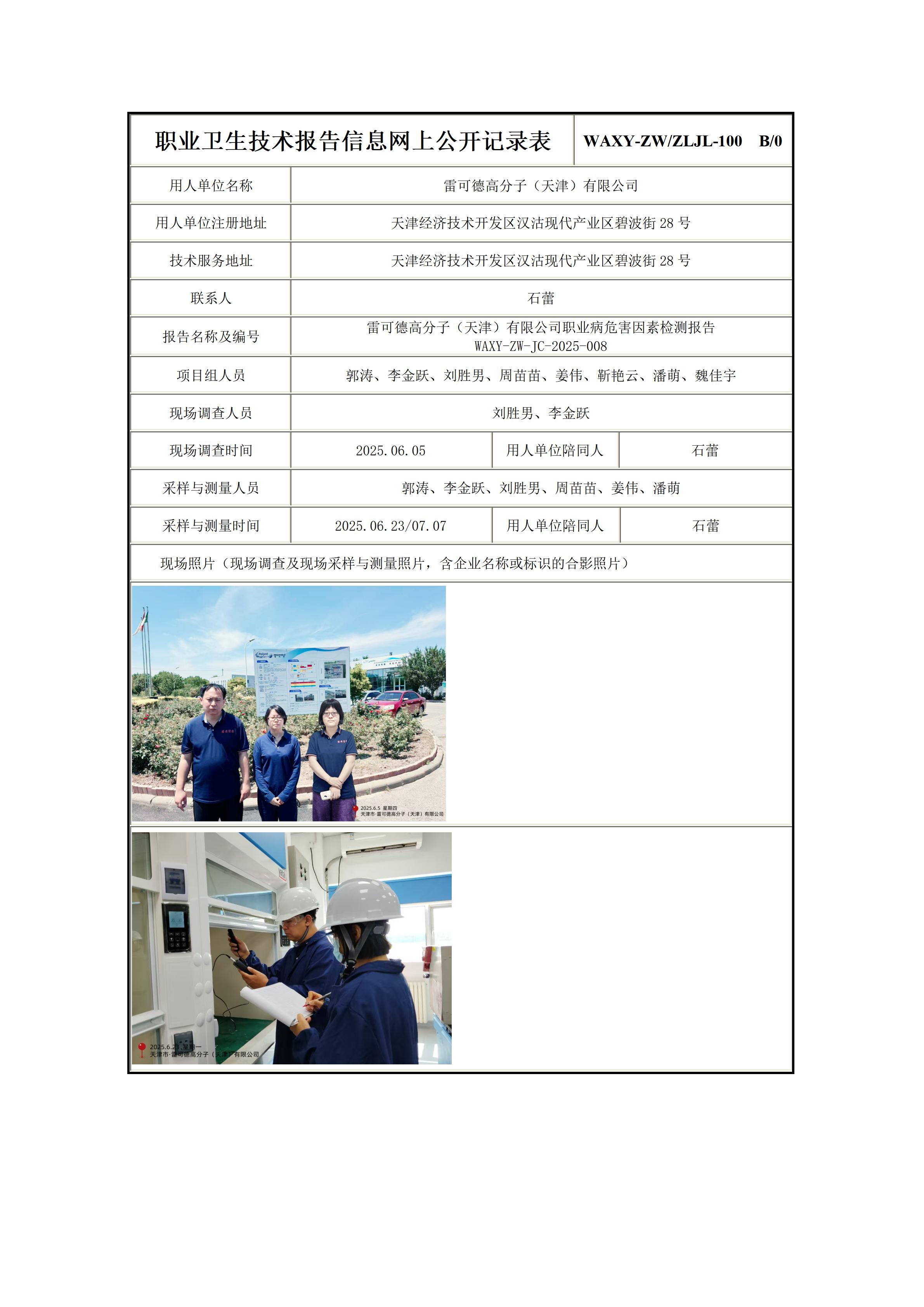 雷可德高分子(天津)有限公司职业病危害因素检测报告信息公示表
