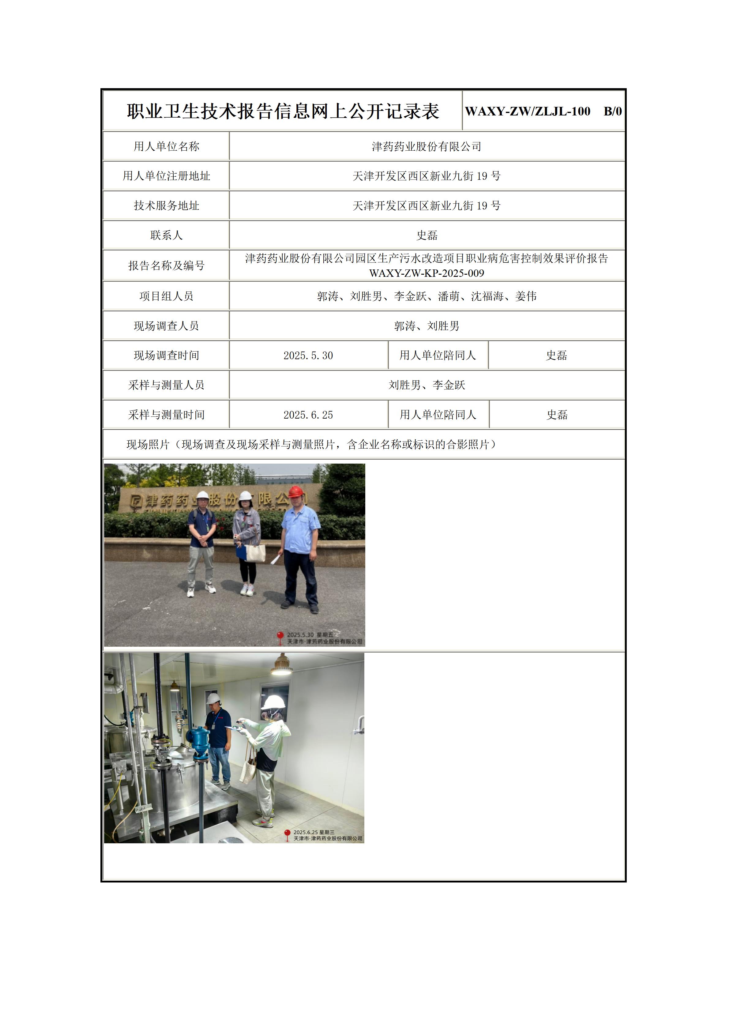 津药药业股份有限公司园区生产污水改造项目职业病危害控制效果评价报告信息公示表