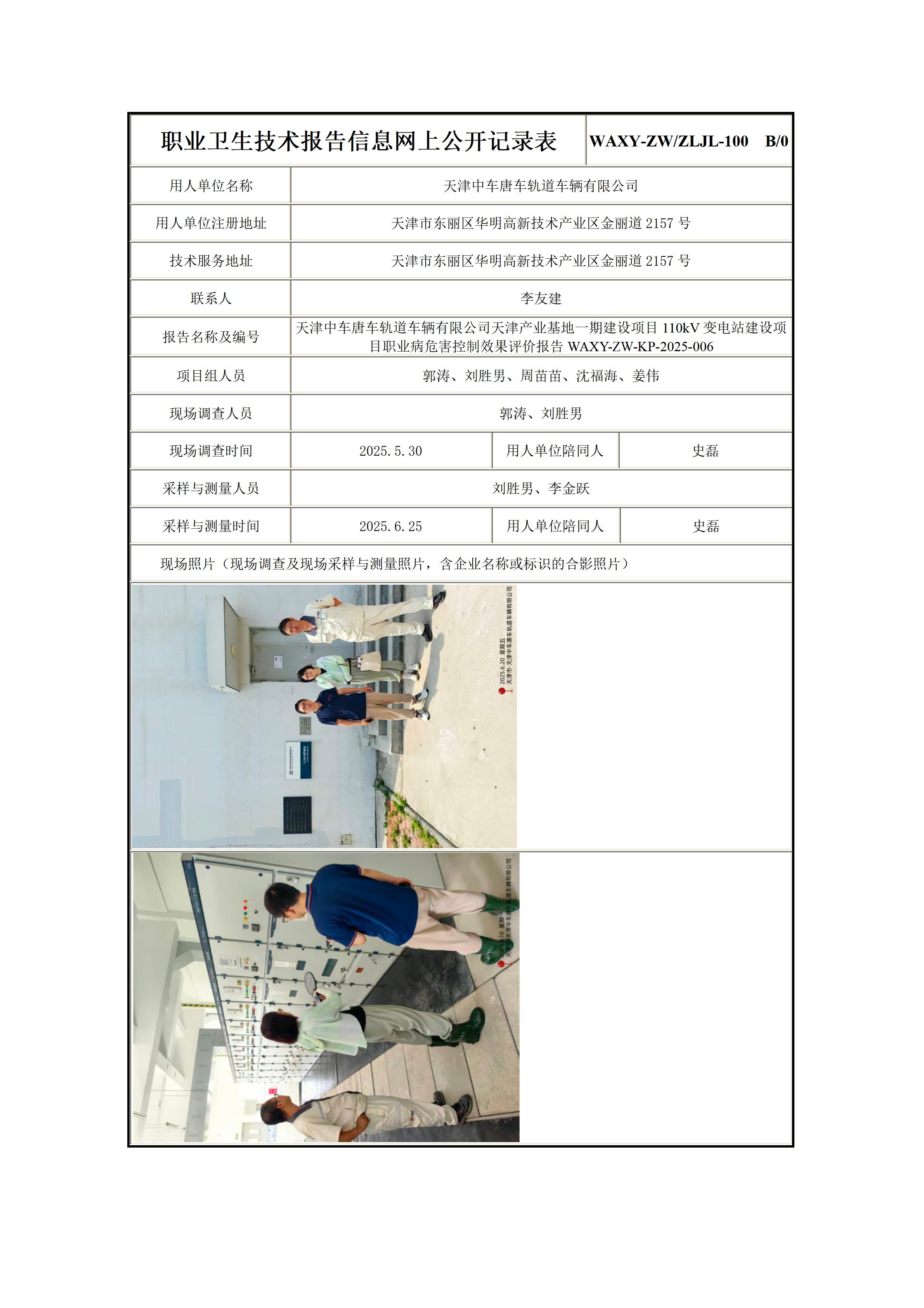 天津中车唐车轨道车辆有限公司天津产业基地一期建设项目110kV变电站建设项目职业病危害控制效果评价报告信息公示表