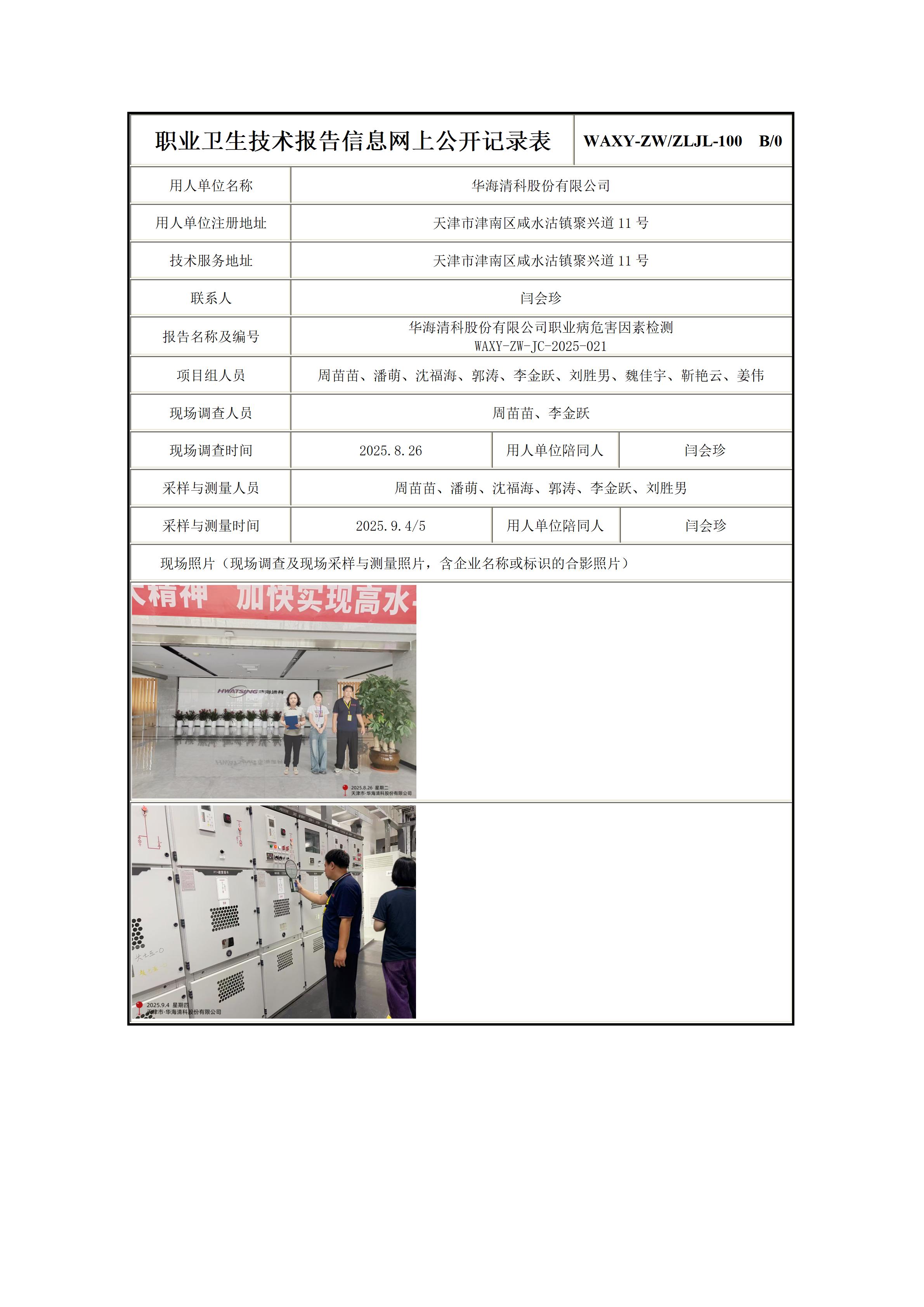 华海清科股份有限公司职业病危害因素检测报告信息公示表