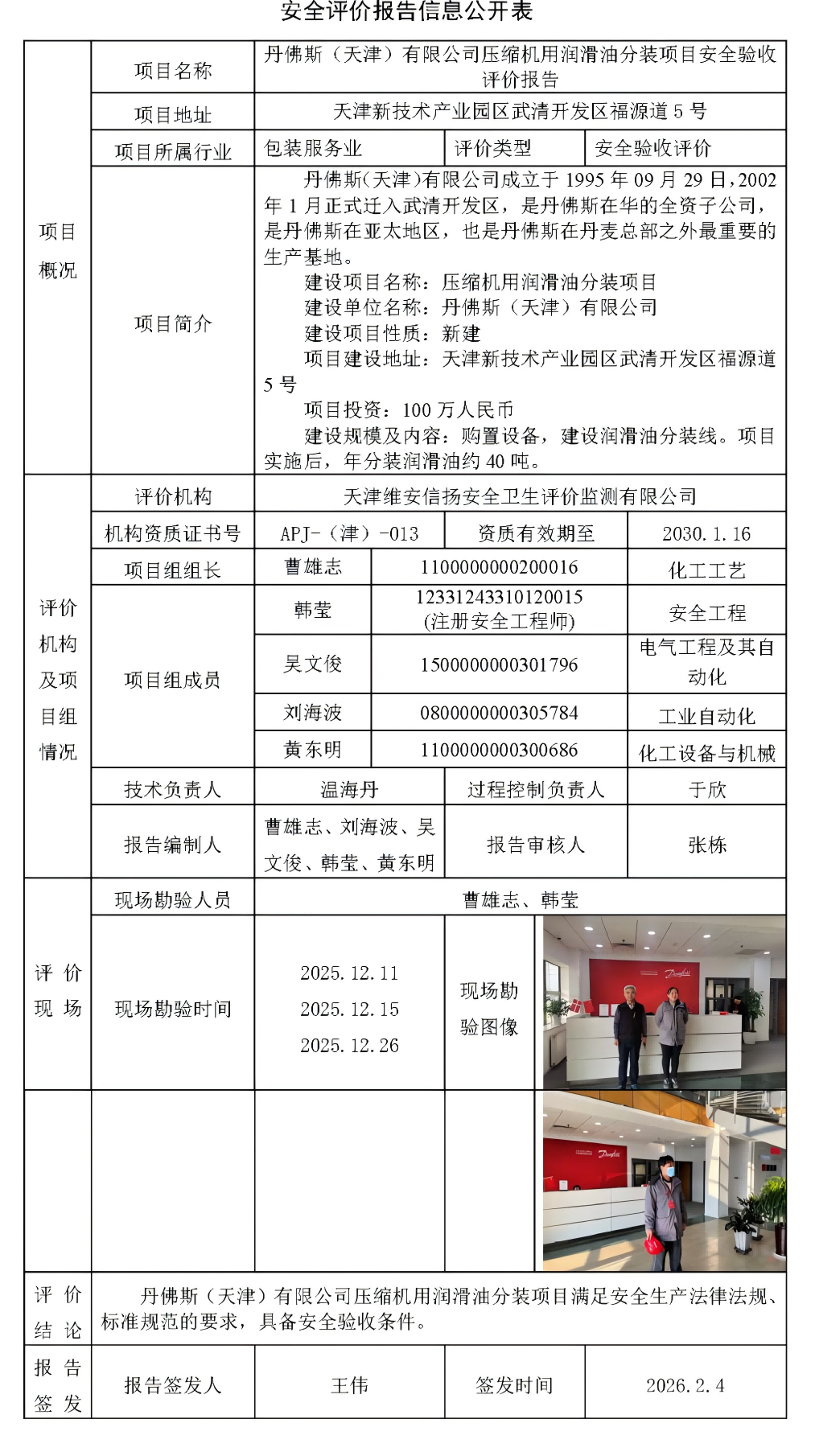 丹佛斯(天津)有限公司压缩机用润滑油分装项目安全验收评价