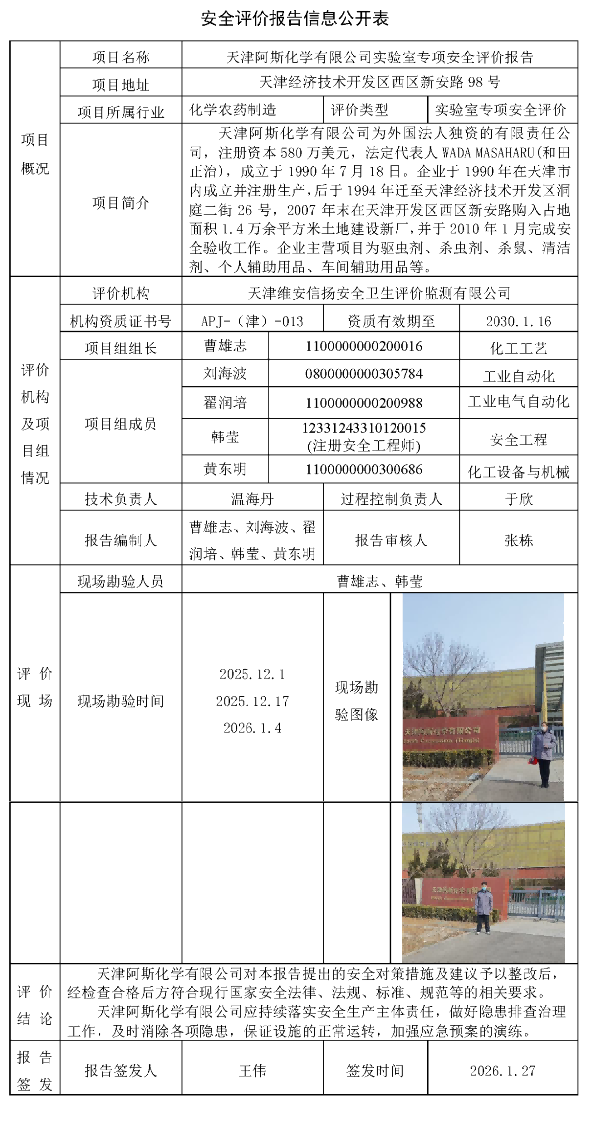 天津阿斯化学有限公司实验室专项安全评价报告