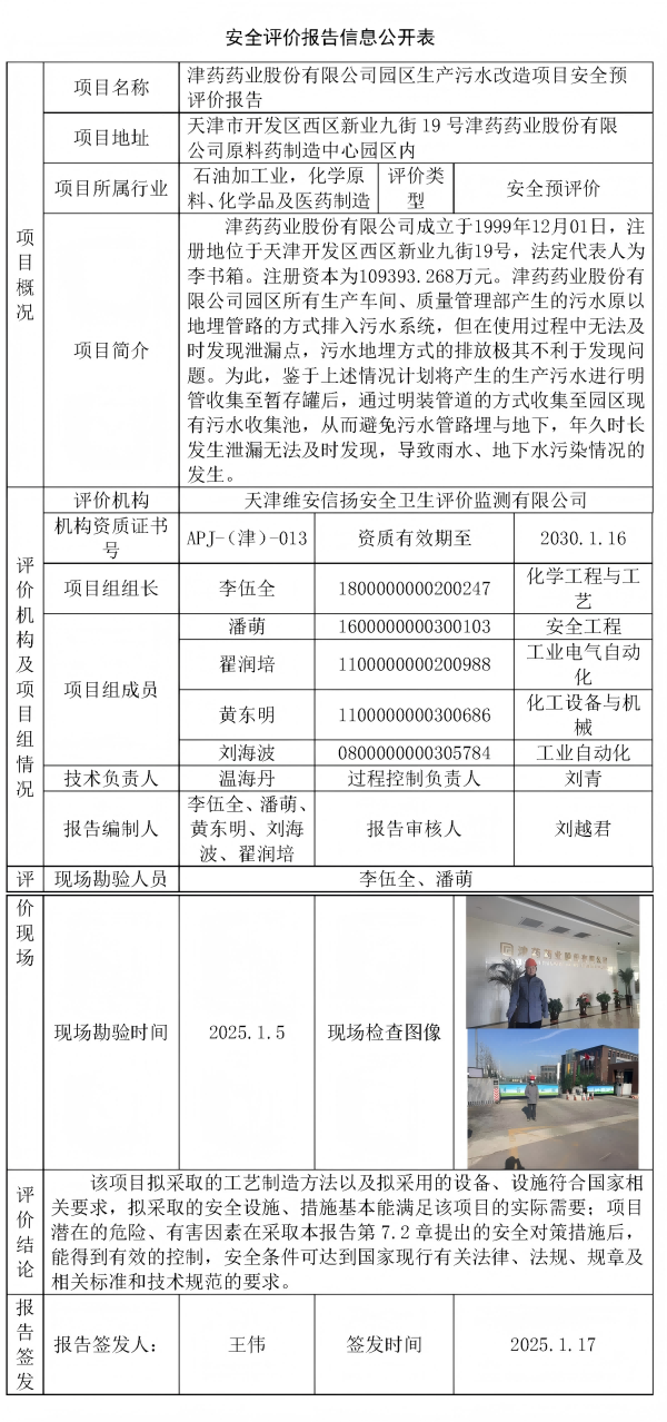 津药药业股份有限公司园区生产污水改造项目安全预评价报告