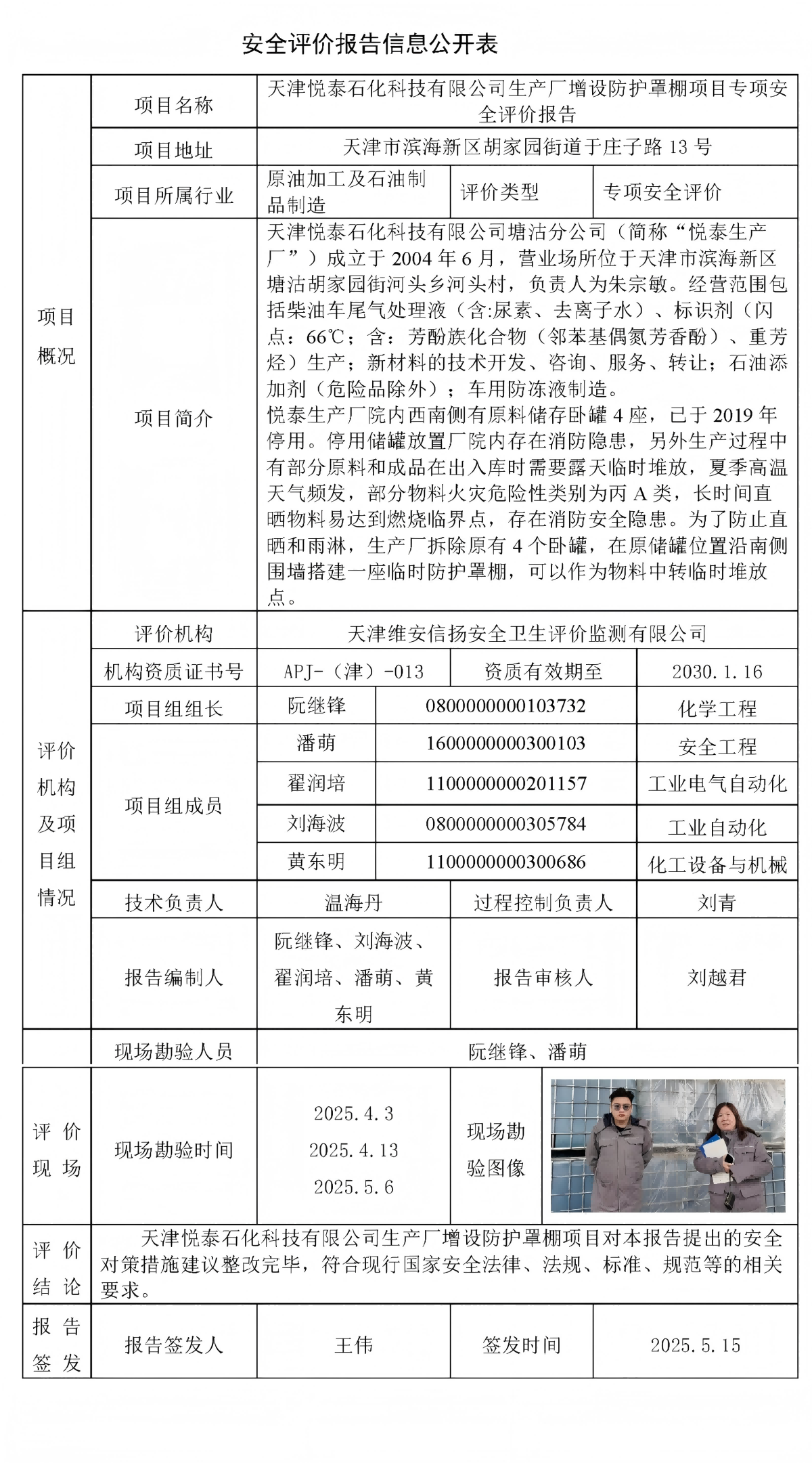 天津悦泰石化科技有限公司生产厂增设防护罩棚项目专项安全评价报告
