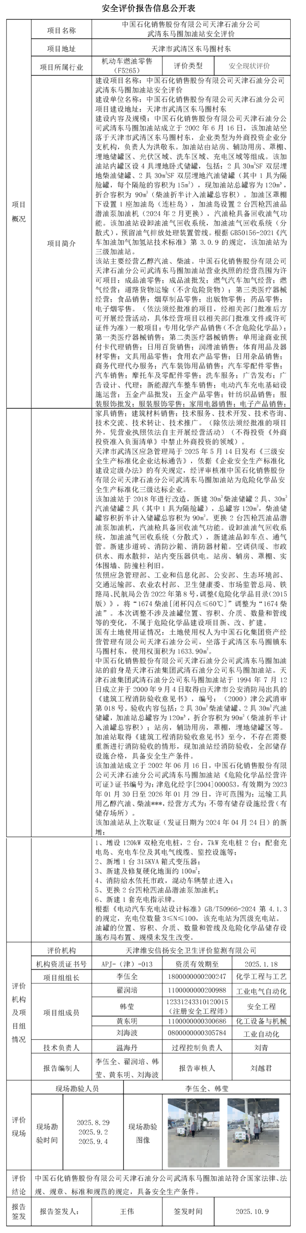 中国石化销售股份有限公司天津石油分公司武清东马圈加油站安全评价