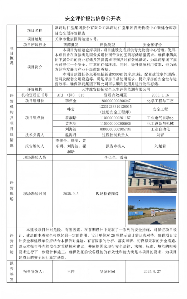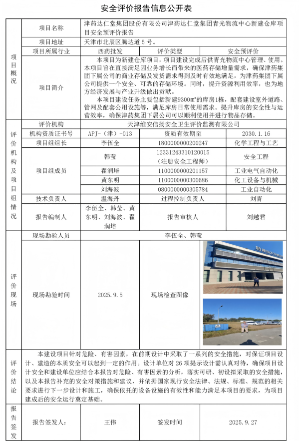 津药达仁堂集团股份有限公司津药达仁堂集团青光物流中心新建仓库项目安全预评价报告