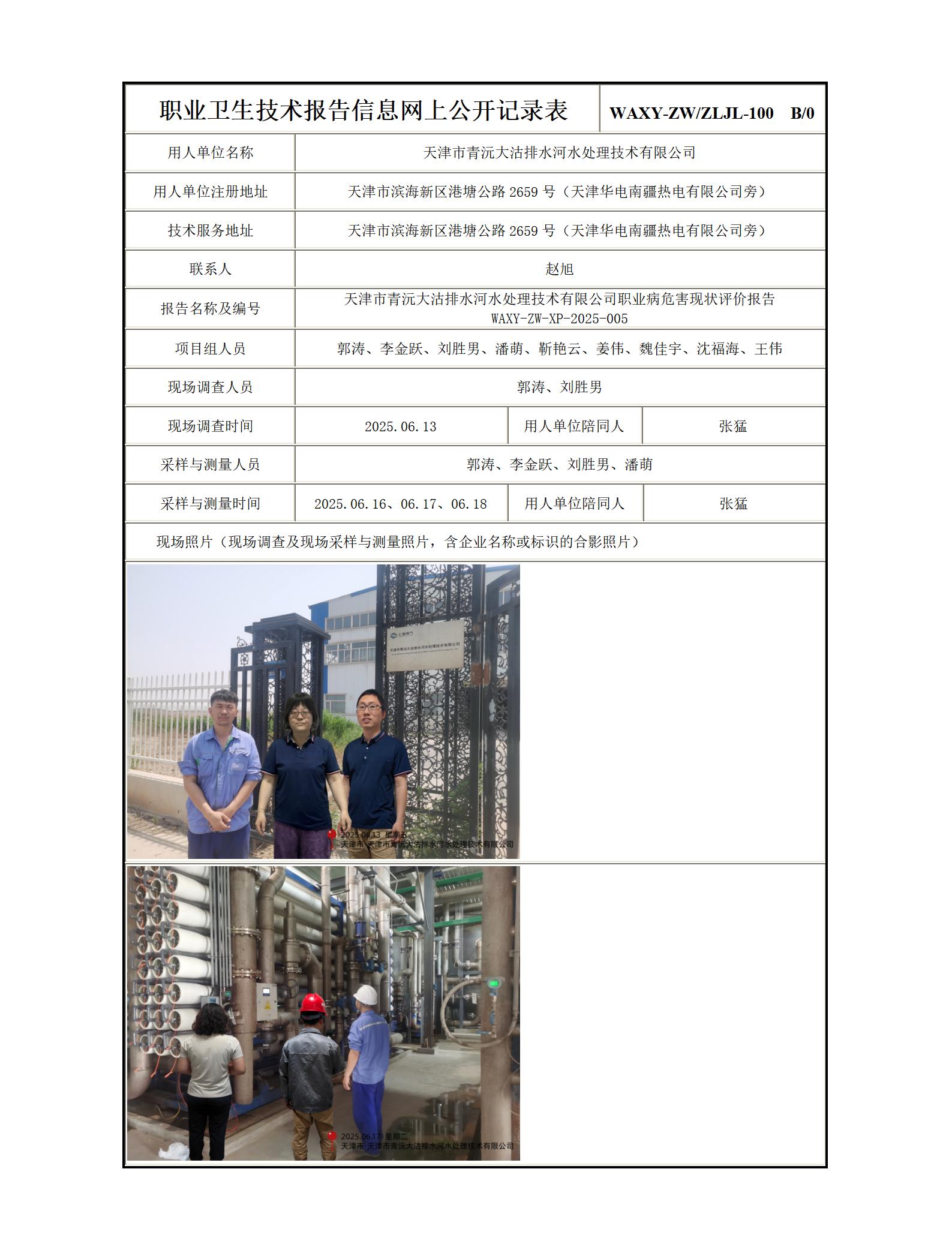 天津市青沅大沽排水河水处理技术有限公司职业病危害现状评价报告信息公示表
