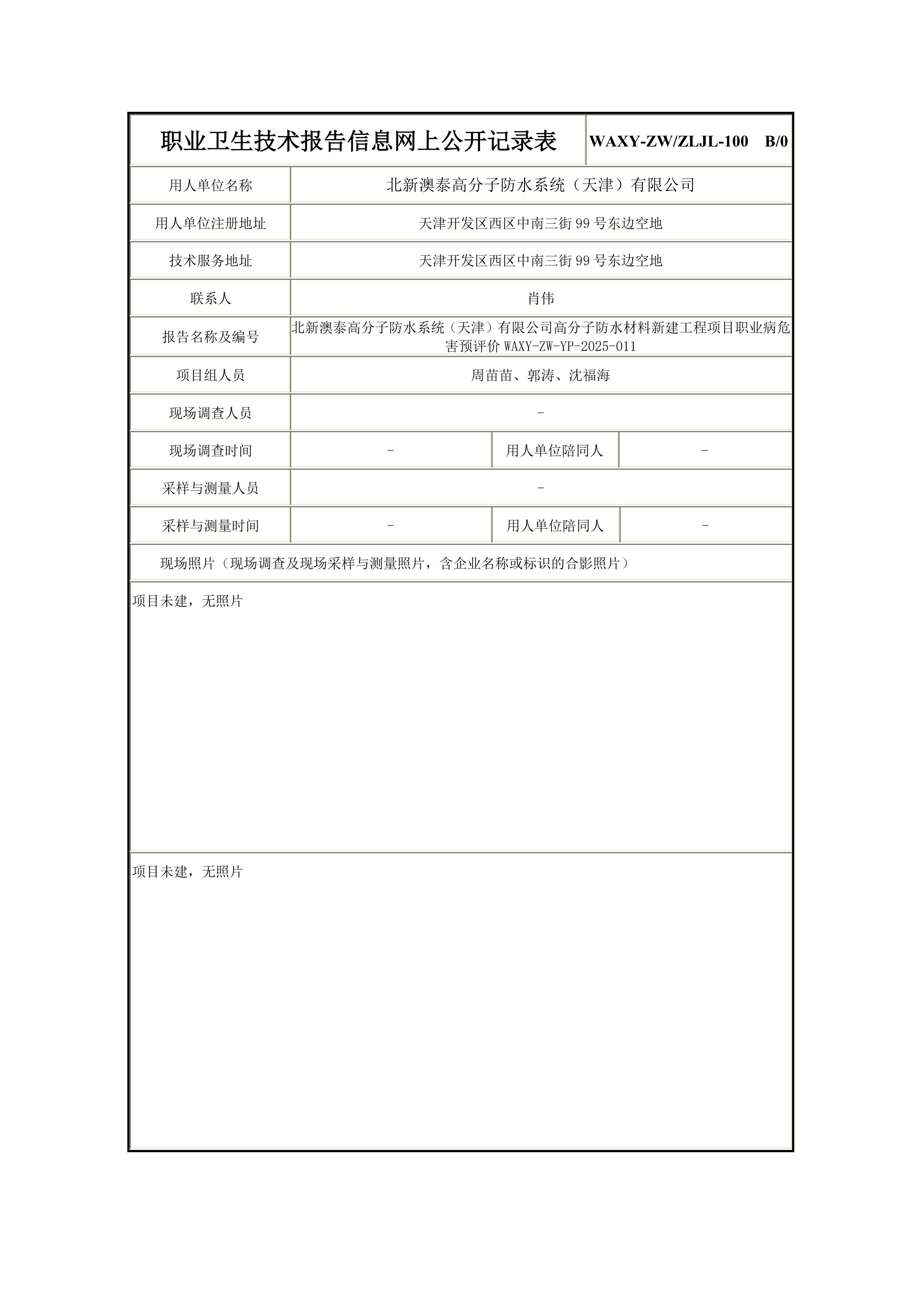 北新澳泰高分子防水系统(天津)有限公司高分子防水材料新建工程项目职业病危害预评价报告信息公示表