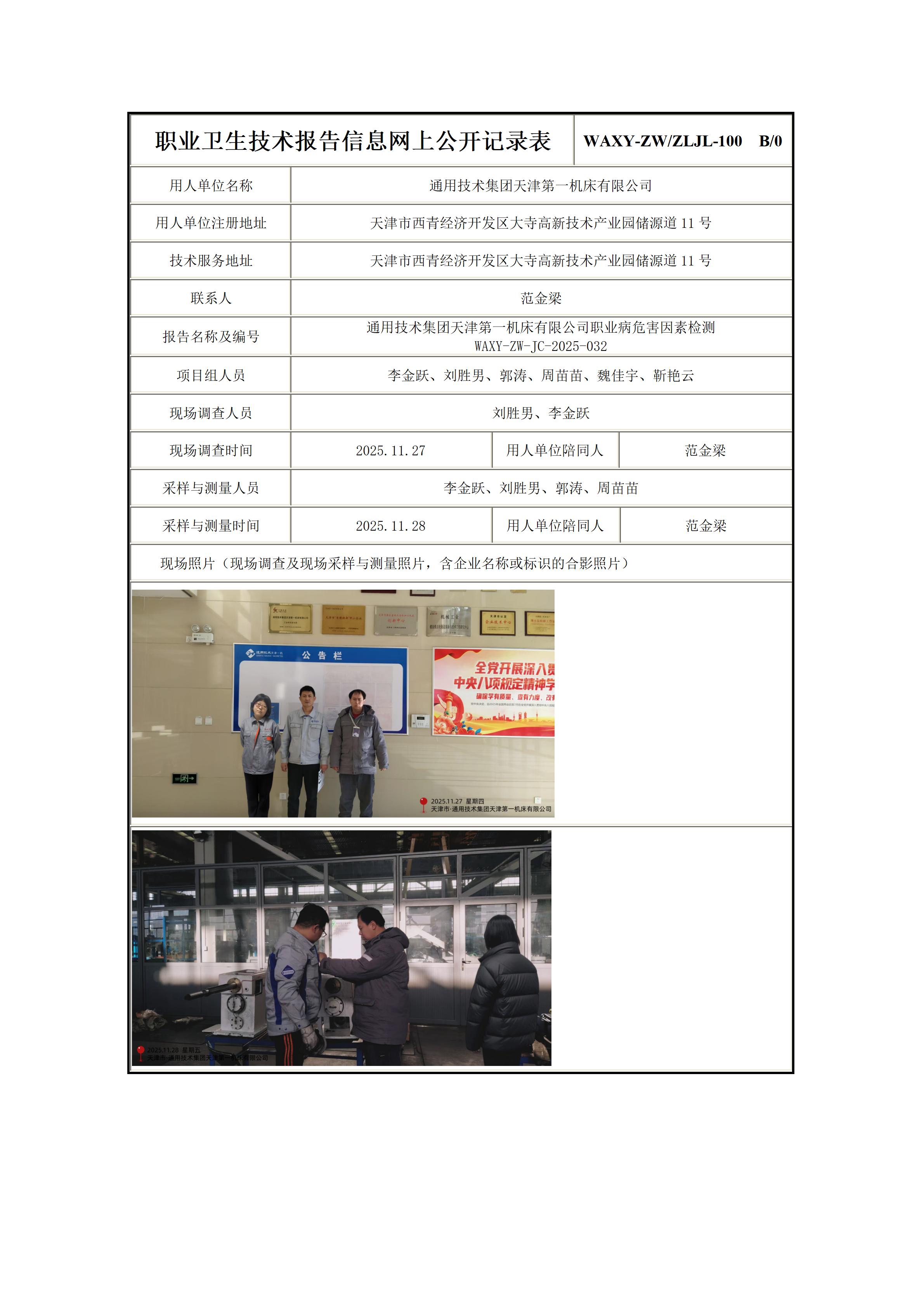 通用技术集团天津第一机床有限公司职业病危害因素检测报告信息公示表