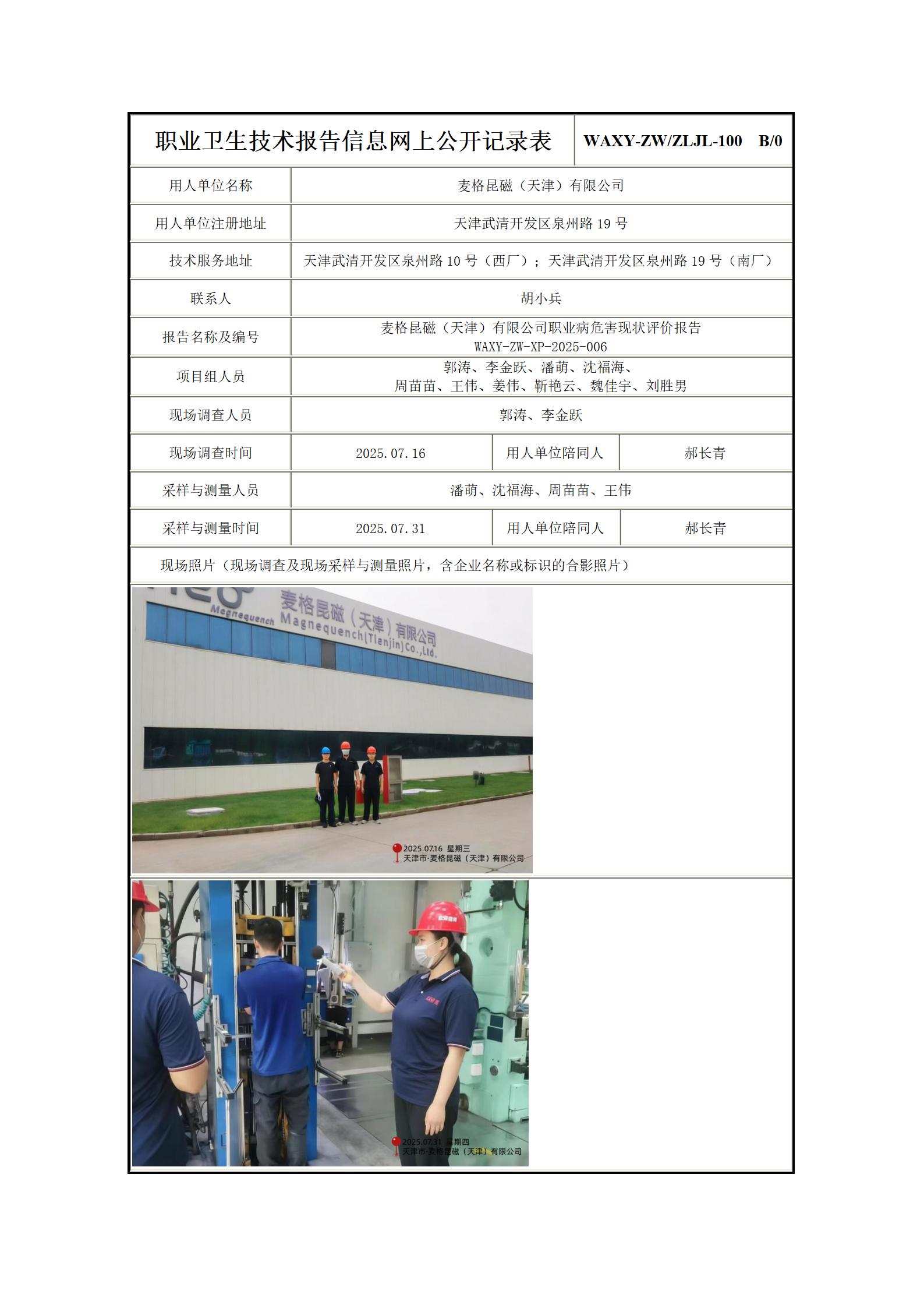 麦格昆磁(天津)有限公司职业病危害现状评价报告信息公示表