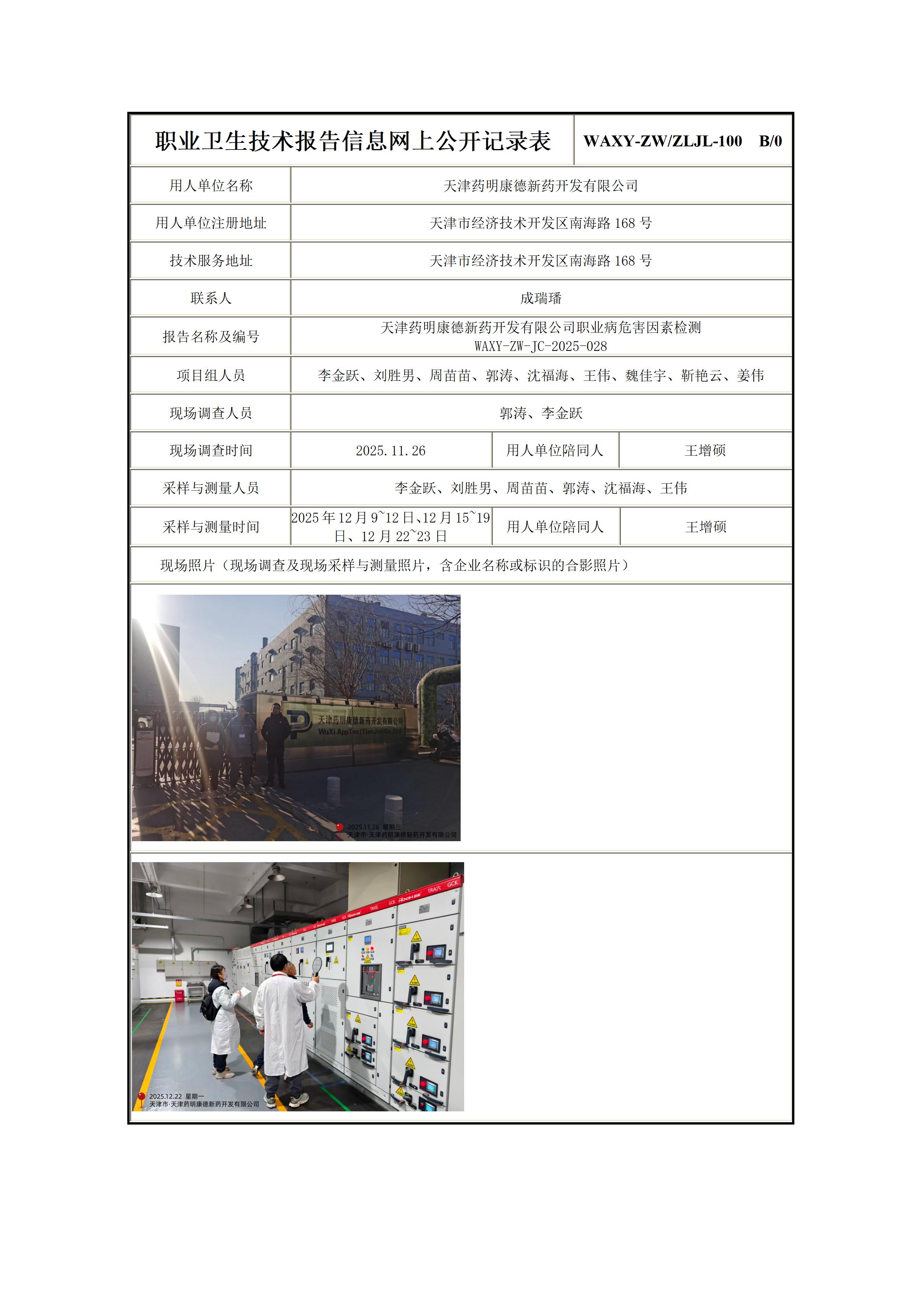 天津药明康德新药开发有限公司职业病危害因素检测报告信息公示表