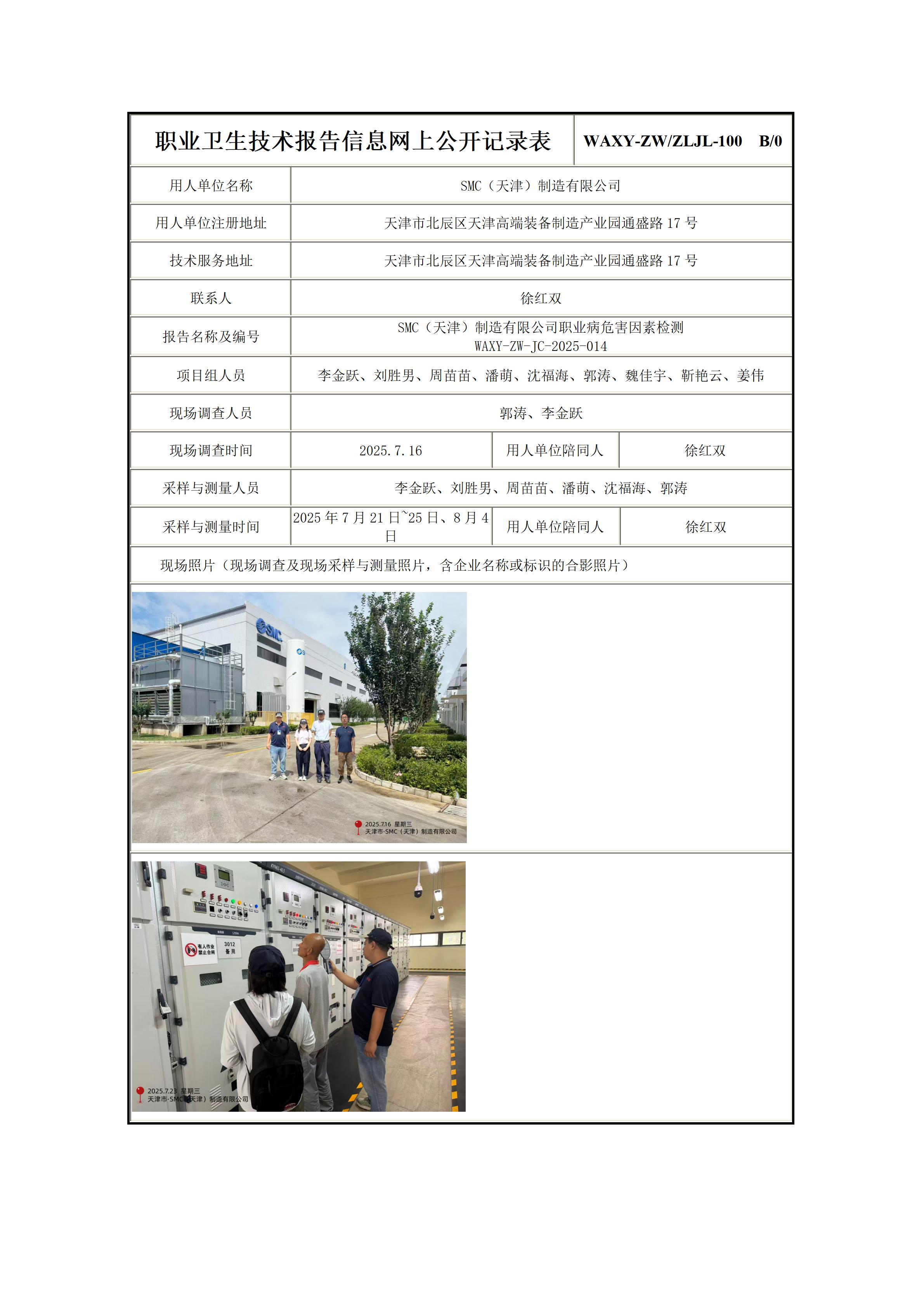 SMC(天津)制造有限公司职业病危害因素检测报告信息公示表