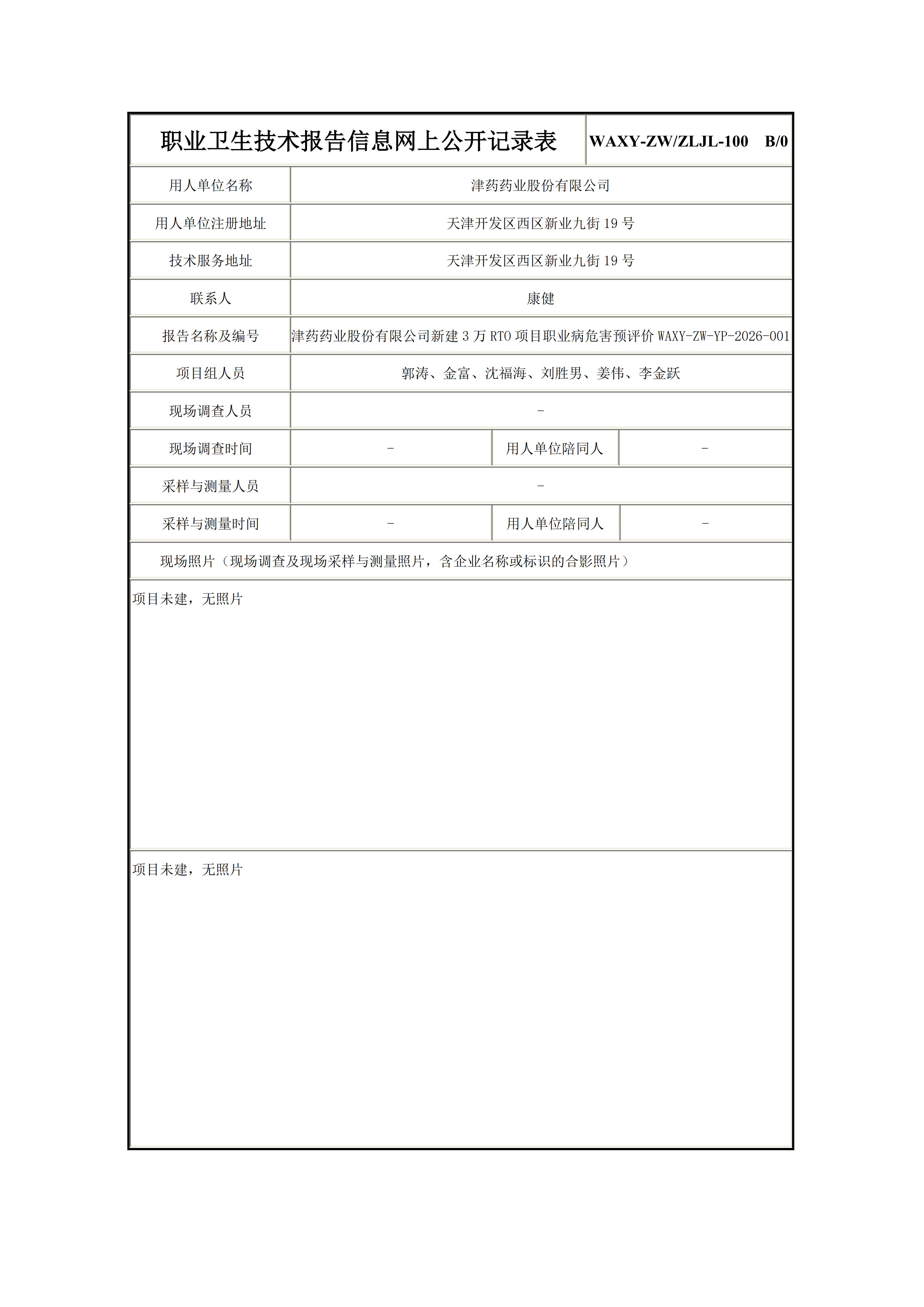 津药药业股份有限公司新建3万RTO项目职业病危害预评价报告信息公示表
