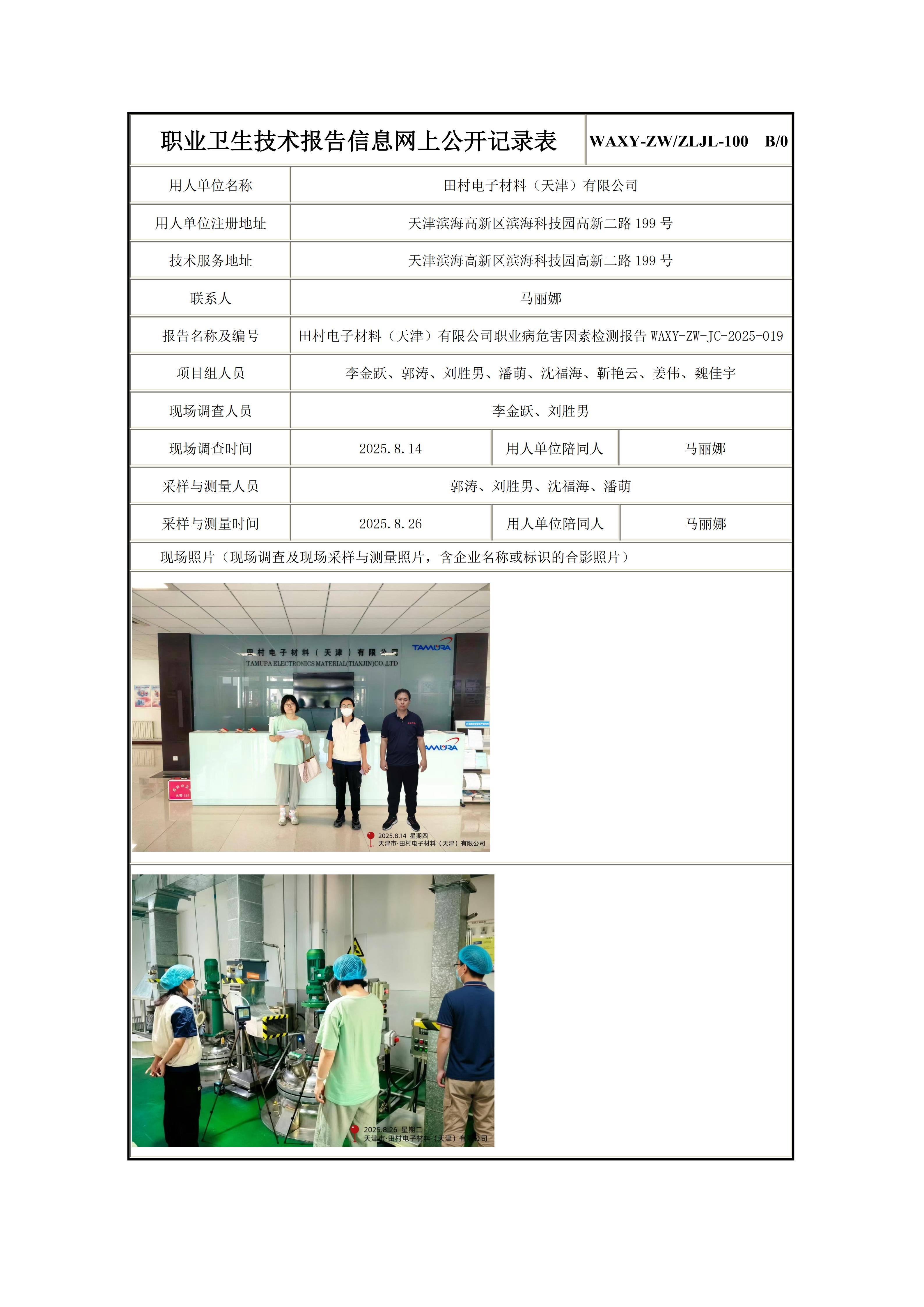 田村电子材料(天津)有限公司职业病危害因素检测报告信息公示表