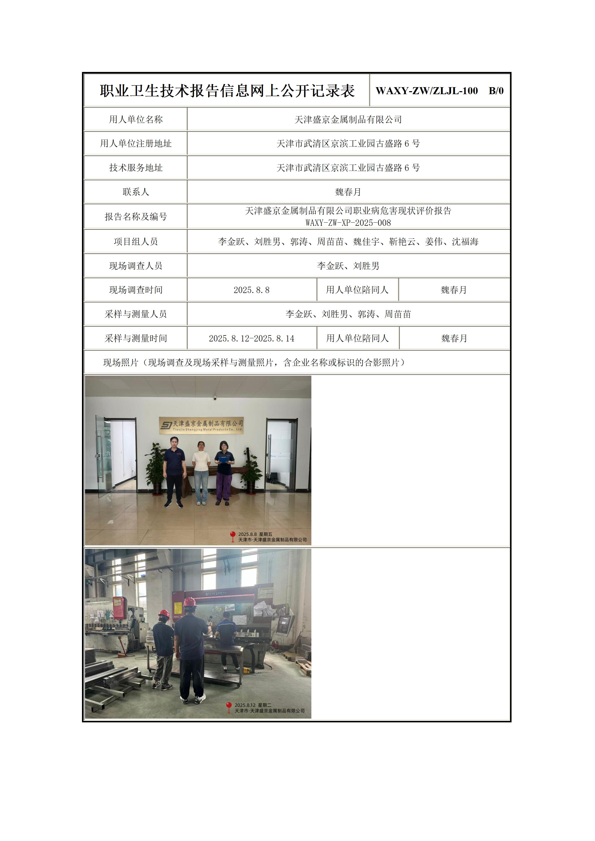 天津盛京金属制品有限公司职业病危害现状评价报告信息公示表